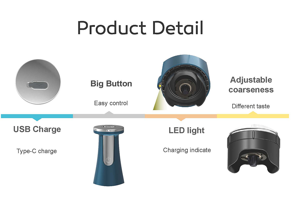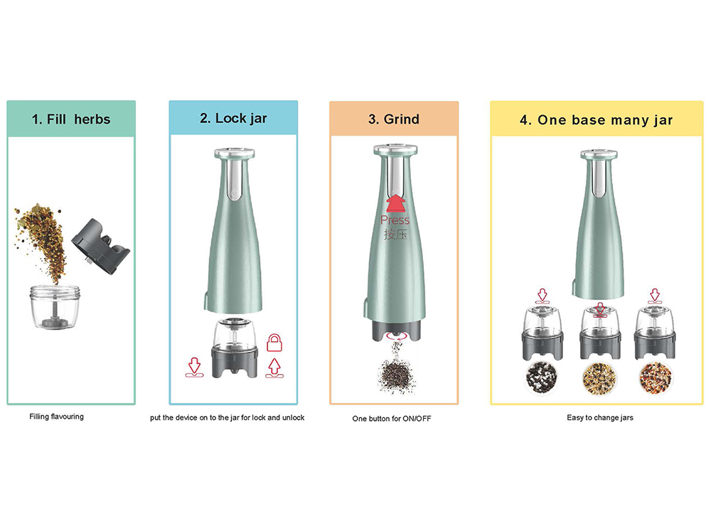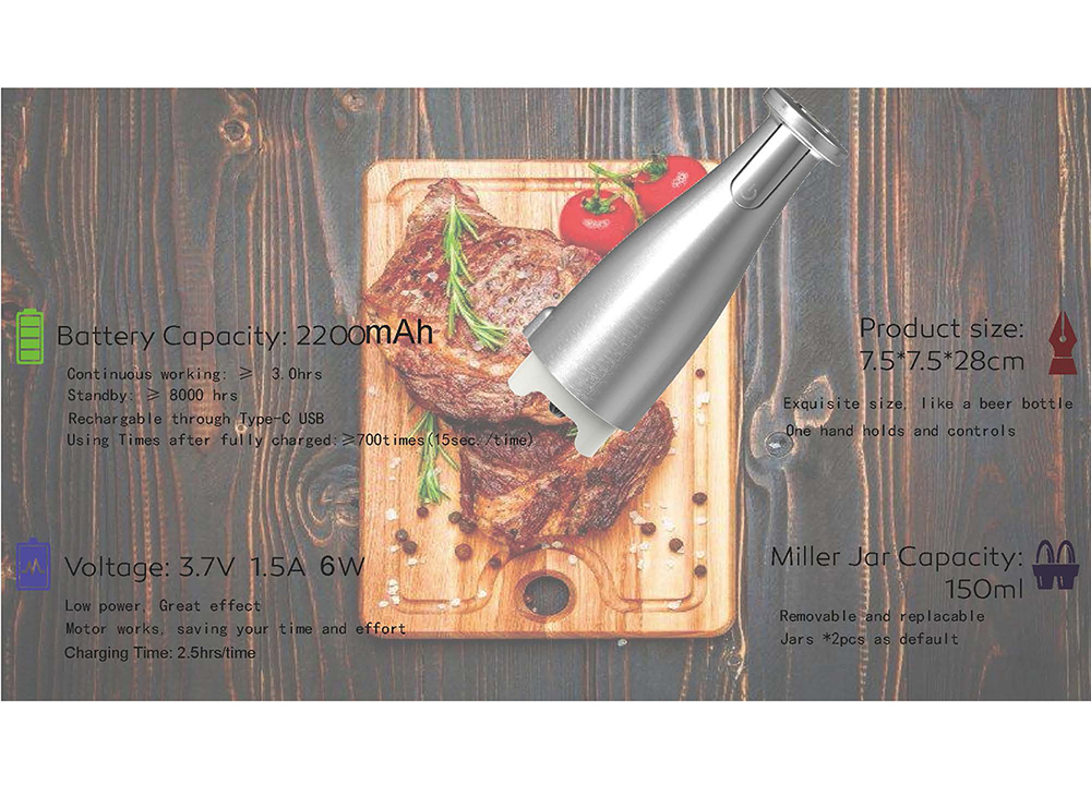 * Interchangeable miller jar for different ingredients like: Black peper, Sea salt, Rosmary, Basil leaves, Herbs and etc.